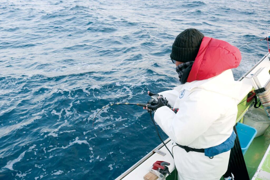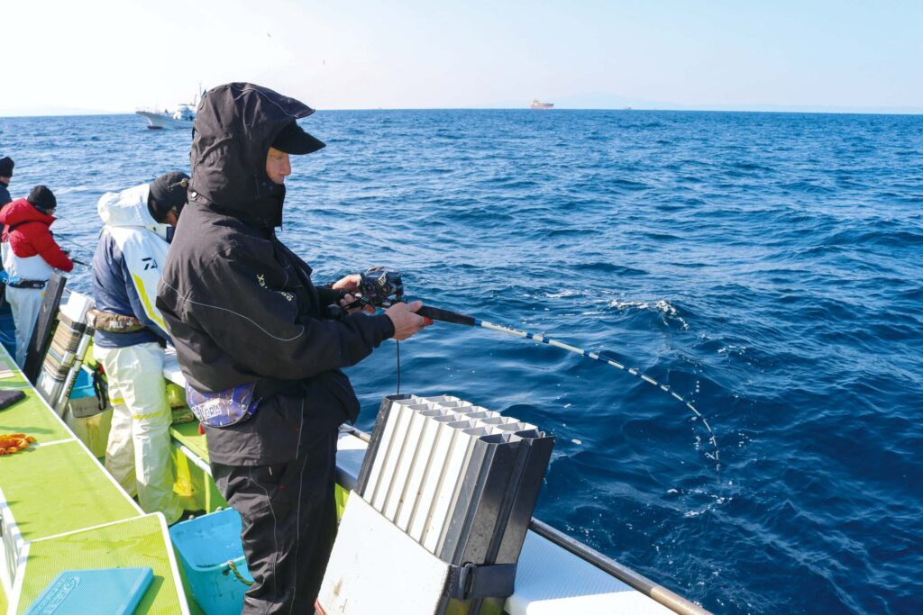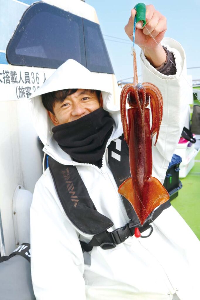 1月下旬の取材日は洲ノ崎沖の水深200〜260メートル前後を流し、前半はスルメイカ主体で後半になるとヤリイカも乗り出した。釣果は5〜26杯と全体的に数はのび、半数以上がツ抜けを達成。ヤリイカは多い人で7〜8杯ほど。まとまってヤリイカが釣れたのは久しぶりとのことで、今後への期待が高まる一日となった。